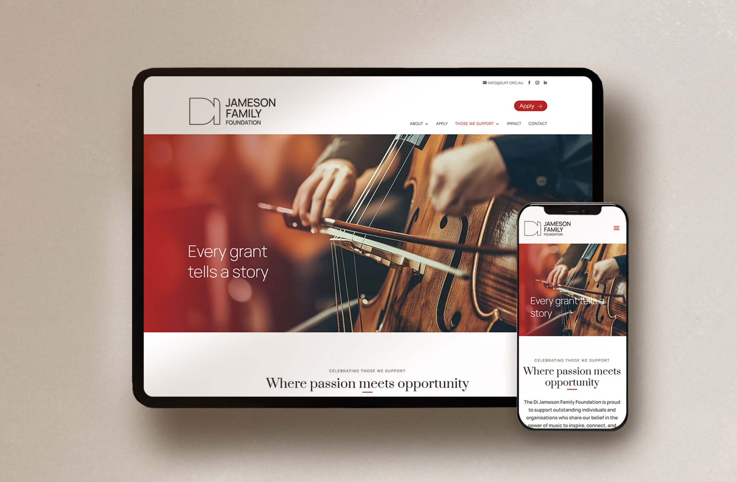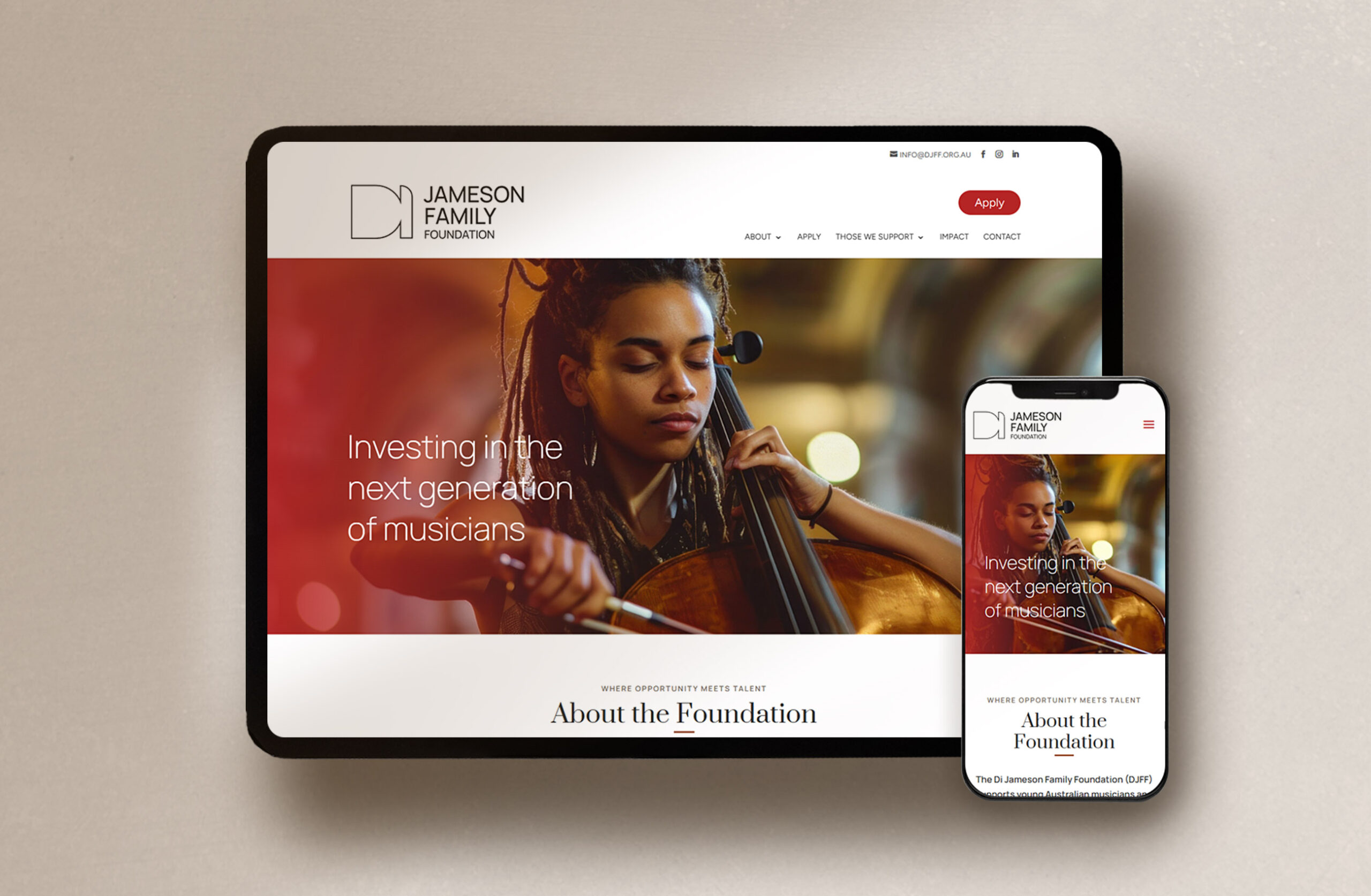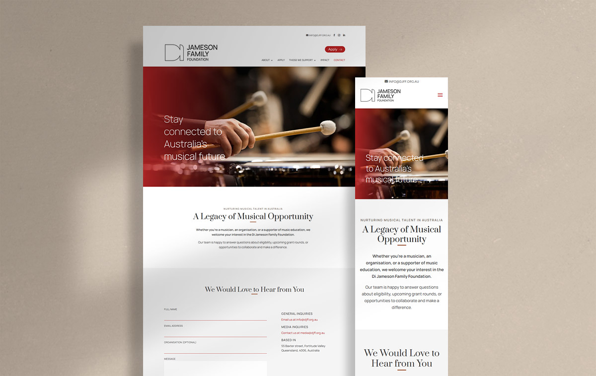 Di Jameson Family Foundation DATCHA WEB : design et programmation CLIENT : Di Jameson Family FoundatioonPLATEFORME : WordPresshttps://djff.org.au AllEn développementEn ligne Di Jameson Family Foundation David Jalbert, pianiste Jane Hope, Designer & Writer Denise Djokic, contrebassiste Allyson McHardy, mezzo-soprano Langevins La Datcha : céramique et illustration Jean-Michel Malouf, chef d’orchestre Agence Blanche Servenay