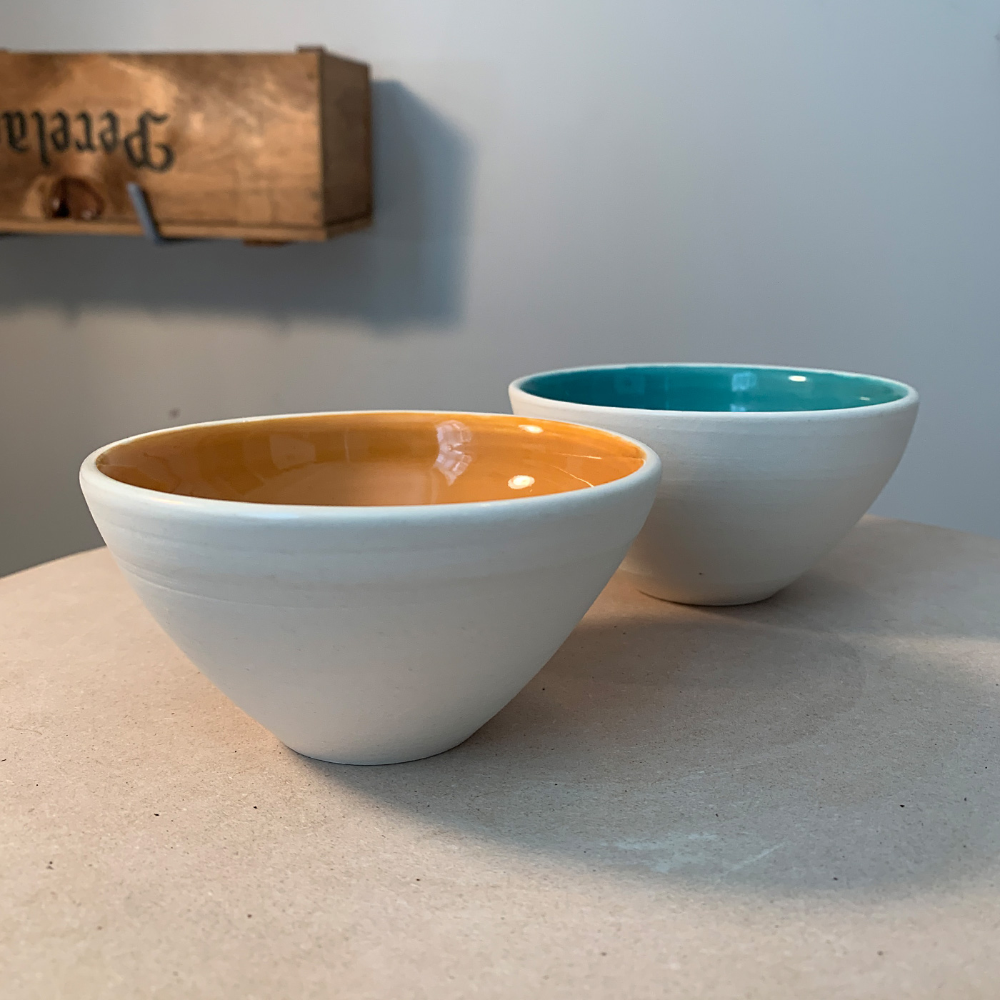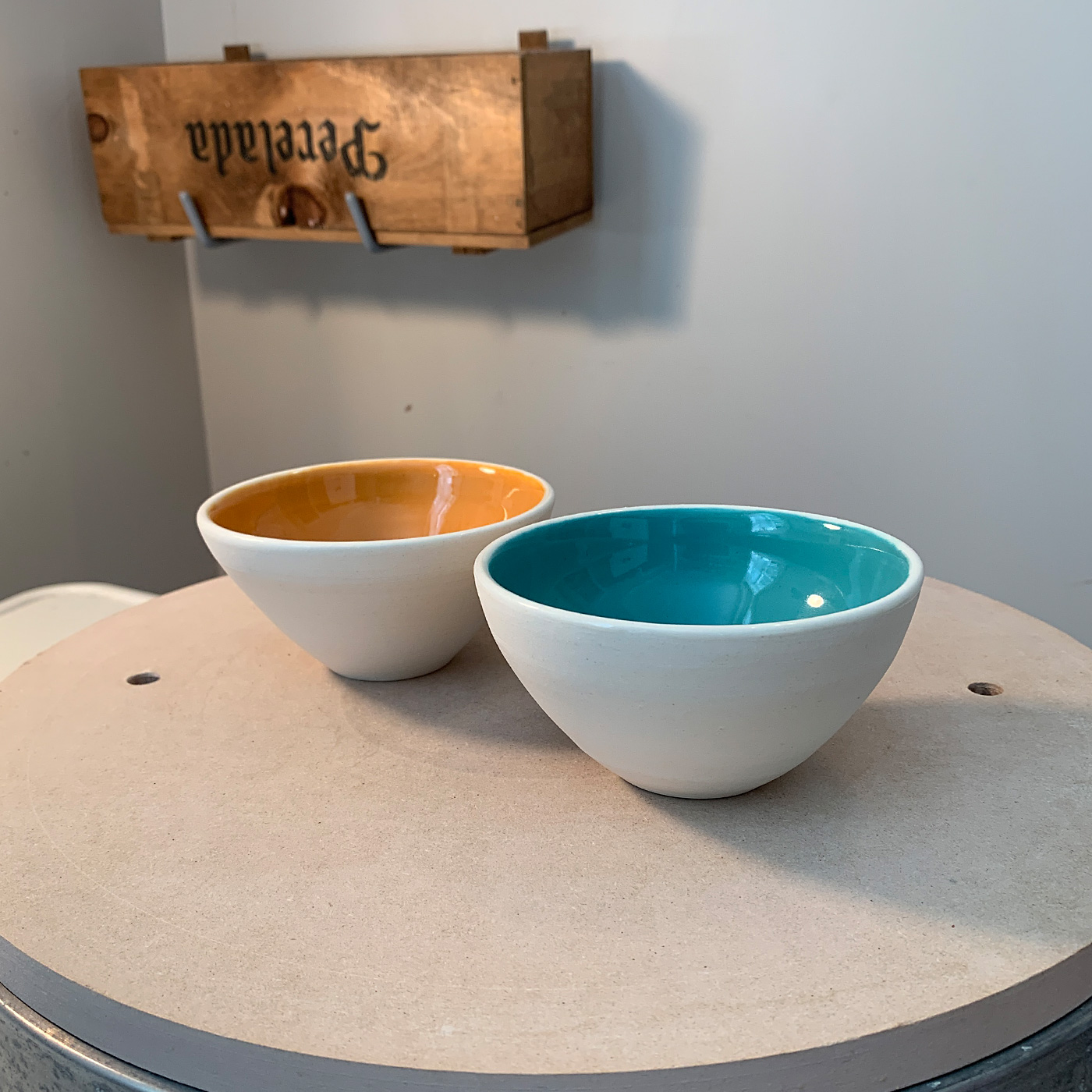 The turquoise bowl has a tiny crack at the bottom, but it still very functional